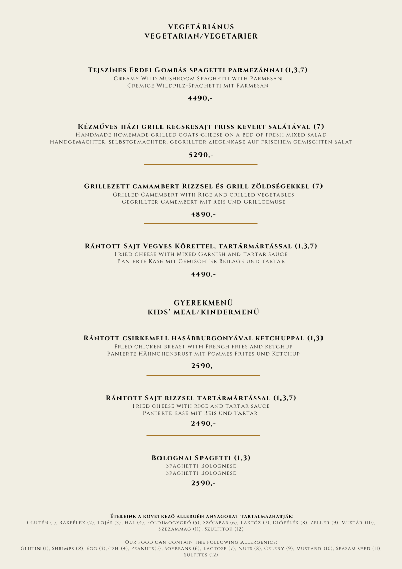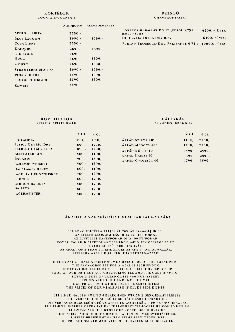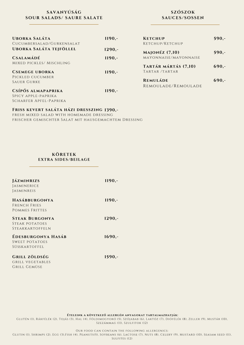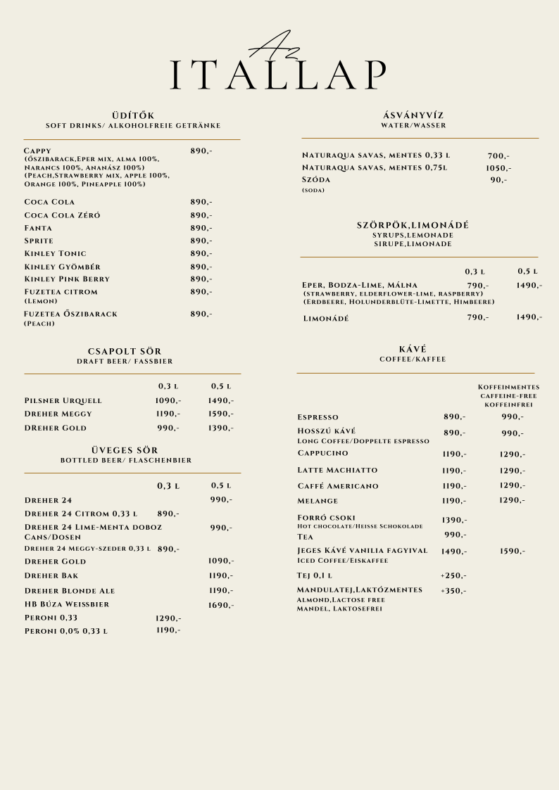 The menu also features lighter fare and salads for those seeking something refreshing or quick, such as the Salmon Salad with Roasted Sesame Seeds or Caesar Salad with Chicken Breast. Grilled and fried poultry dishes bring a familiar touch to the selection, suited for casual dinners where comfort and flavor are the priority. The inclusion of seasonal handcrafted drinks and classic Hungarian beverages like Jeges Kávé (iced coffee) and freshly made Limonádé add a cooling balance on warmer days.