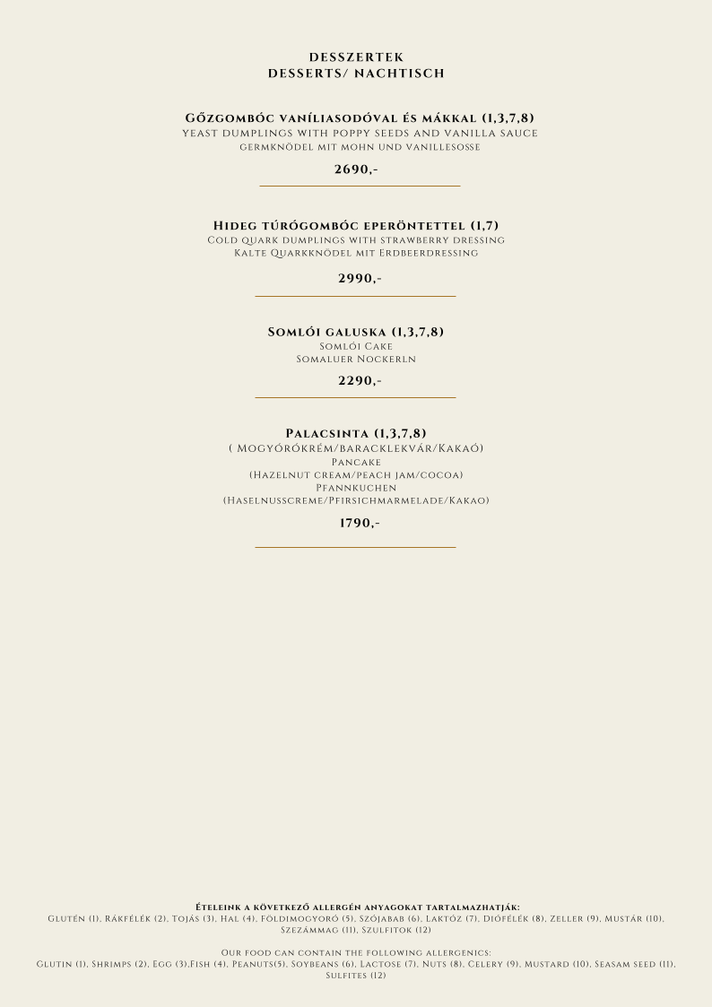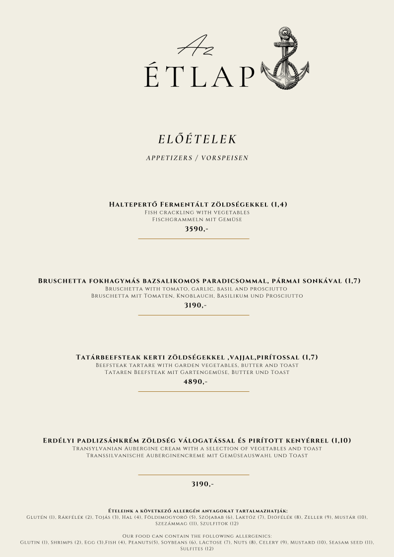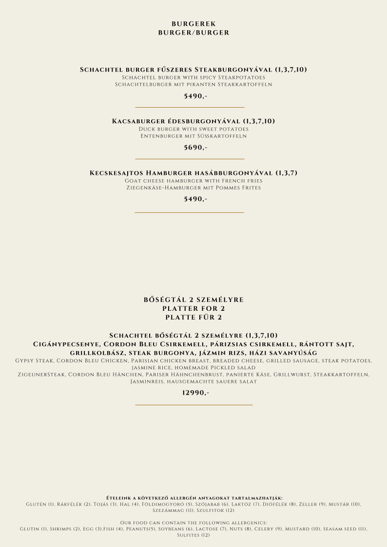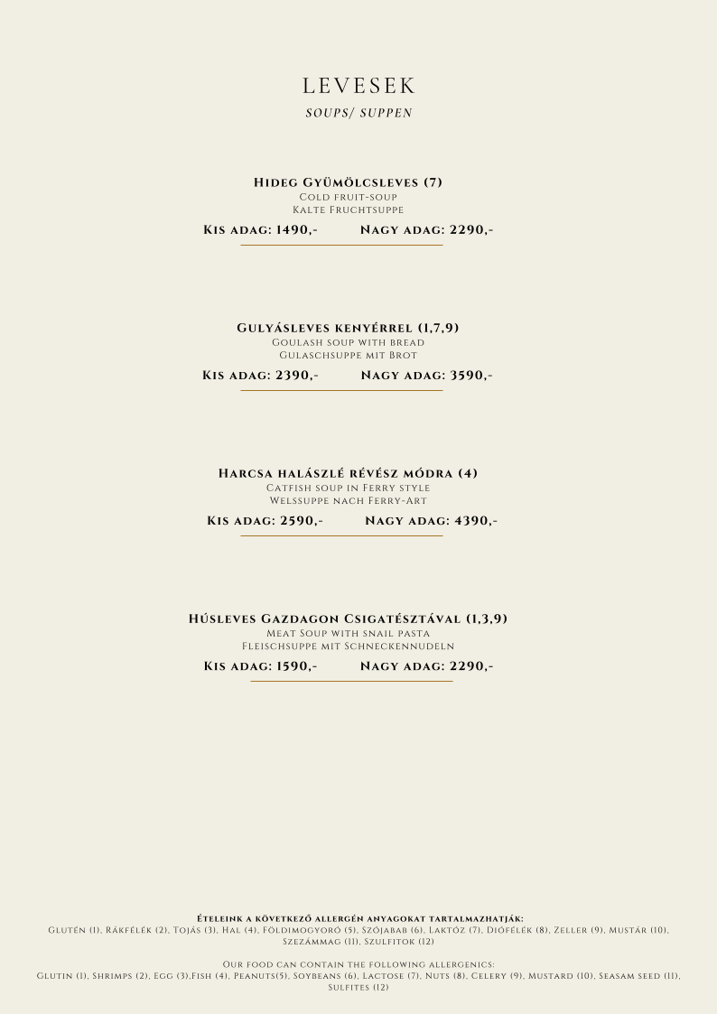 The menu also features lighter fare and salads for those seeking something refreshing or quick, such as the Salmon Salad with Roasted Sesame Seeds or Caesar Salad with Chicken Breast. Grilled and fried poultry dishes bring a familiar touch to the selection, suited for casual dinners where comfort and flavor are the priority. The inclusion of seasonal handcrafted drinks and classic Hungarian beverages like Jeges Kávé (iced coffee) and freshly made Limonádé add a cooling balance on warmer days.